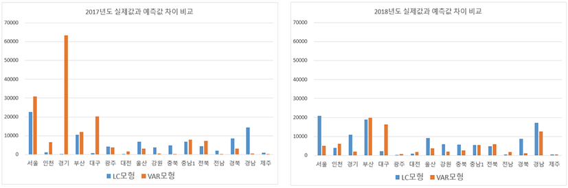 <그림 7>은 연간 거래량의 실제값과 예측값의 차이를 비교한 것인데 2017년도의 경우 LC모형은 서울과 부산, 경남지역에서 가장 큰 차이를 보여주었으며, VAR모형은 서울, 경기, 부산, 대구지역에서 가장 큰 차이를 보여주었다. 2018년도의 경우에는 1월~10월까지의 거래량을 나타낸 것인데 LC모형은 서울, 부산, 경남지역에서 VAR모형은 부산, 대구, 경남지역에서 가장 큰 차이를 보여주었다.
